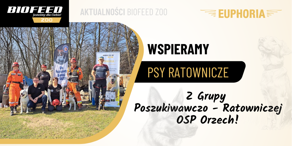 Z dumą informujemy, że jako marka Euphoria wspieramy Grupę Poszukiwawczo-Ratowniczą OSP Orzech. Ci niezwykli ratownicy – zarówno na dwóch, jak i czterech łapach – każdego dnia angażują się w ratowanie ludzkiego życia. Psy ratownicze odgrywają kluczową rolę w akcjach poszukiwawczych, dlatego chcemy zadbać o ich odpowiednie żywienie. Dostarczając wysokiej jakości produkty, pomagamy im utrzymać doskonałą kondycję i gotowość do pracy w trudnych warunkach.