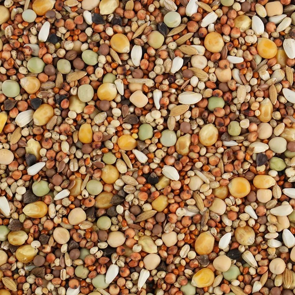 Sorgo czerwone 22%, groch zielony i żółty drobny /ptasi/ 19%, kukurydza popcorn drobna 17%, dari 12%, wyka 5%, jęczmień łuskany 5%, kardi 4%, ryż paddy 2%, proso czerwone 7%, gryka 2%, proso żółte 2%, ryż łuszczony 1%, len 1%, rzepak 0,5%, konopie 0,5%.