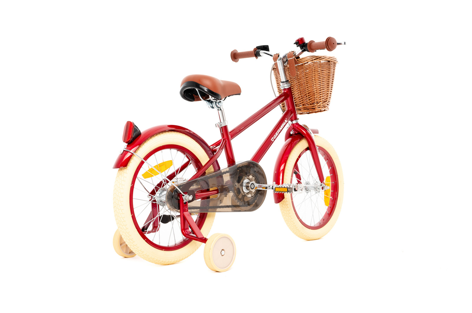 Rowerek dziecięcy w stylu VINTAGE 16”Rowerek dziecięcy w stylu VINTAGE marki Germina to nie tylko pojazd, ale także symbol przygody, radości i niezapomnianych chwil spędzonych na dwóch kółkach. Dzięki starannej konstrukcji, solidności i wyjątkowemu designowi, ten rowerek nie tylko rozwija umiejętności dziecka, ale także zapewnia mu bezpieczną i komfortową podróż w każdym zakątku świata, który ma ochotę odkryć. Z rowerkiem marki Germina każda droga staje się niezwykłą przygodą, a każda chwila spędzona na nim staje się niezapomnianym wspomnieniem.Bezpieczna jazda w każdych warunkach!Dzięki błotnikom jazda nawet w niepogodzie będzie przyjemna. Rowerek został wyposażony w niezawodny hamulec torpedo. Proste i skuteczne hamowanie to podstawa bezpieczeństwa każdego małego rowerzysty. Połączenie przedniego hamulca U-Brake oraz tylnego Torpedo będą w pełni niezawodne podczas podróży Twojego dziecka. Jego dużą zaletą jest prosta konstrukcja, lekkość i łatwa konserwacja.Ten stylowy rowerek został wyposażony w szerokie i stabilne kółka podporowe, błotniki i wiklinowy koszyk.Pewny chwytUchwyty kierownicy w rowerze GERMINA są dobrze wyprofilowane, co zapewnia lepszą kontrolę nad rowerem.Specyfikacja:Materiał ramy: StalRozmiar koła: 16”Hamulec tył: TorpedoHamulec przód: U-BrakeOsłona łańcucha: PełnaWyposażenie: Błotniki, dzwonek, koszyk wiklinowy, odblaski, kółka boczneRower przeznaczony dla dzieci w wieku: 4-6 lat Każdy rower jest fabrycznie zapakowany, czyli ma zdemontowaną kierownicę, siodło, pedały. Elementy te należy złożyć samodzielnie. W niektórych egzemplarzach może być koniecznie wykonanie niektórych podstawowych regulacji, które opisuje instrukcja obsługi.