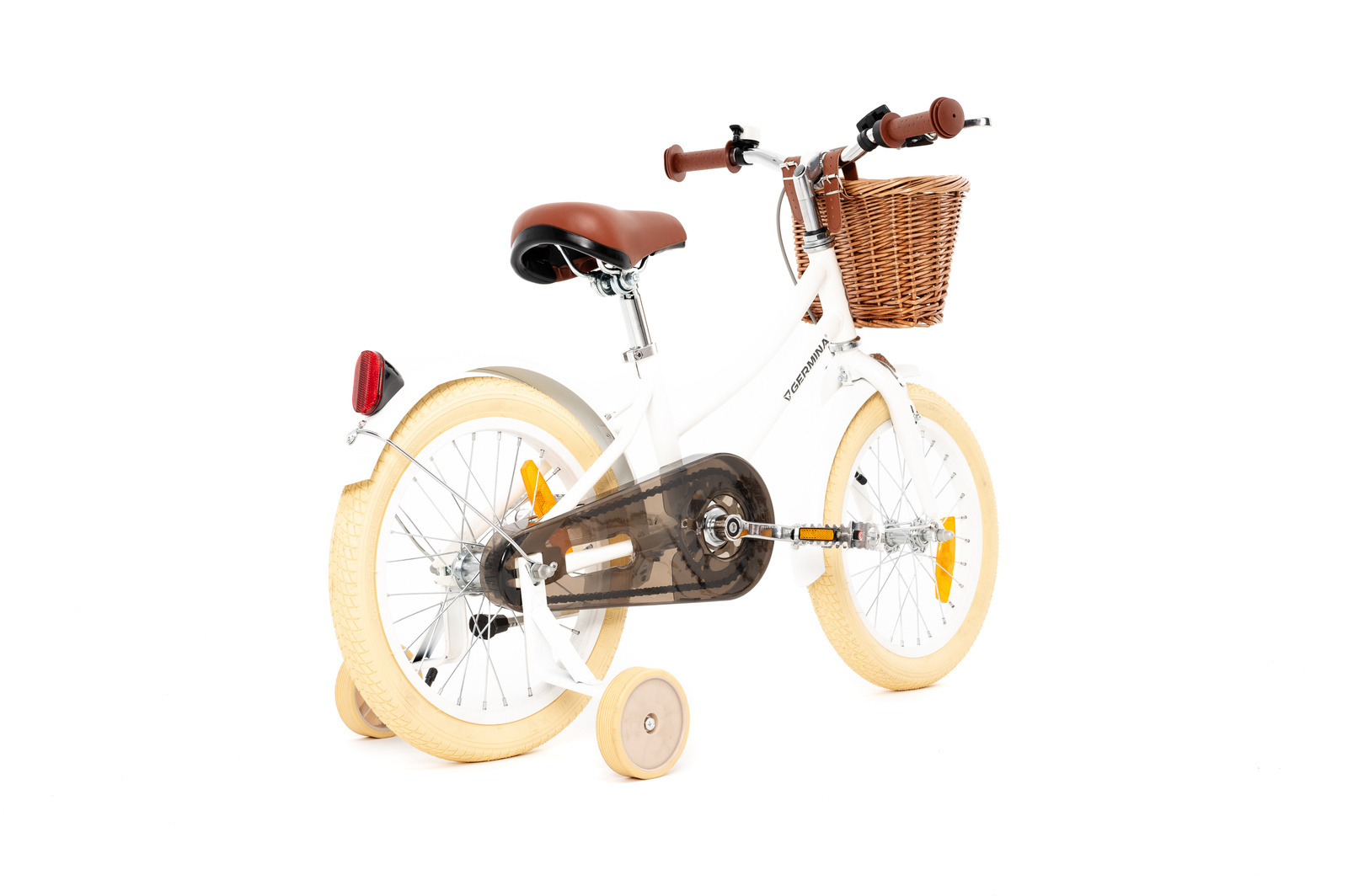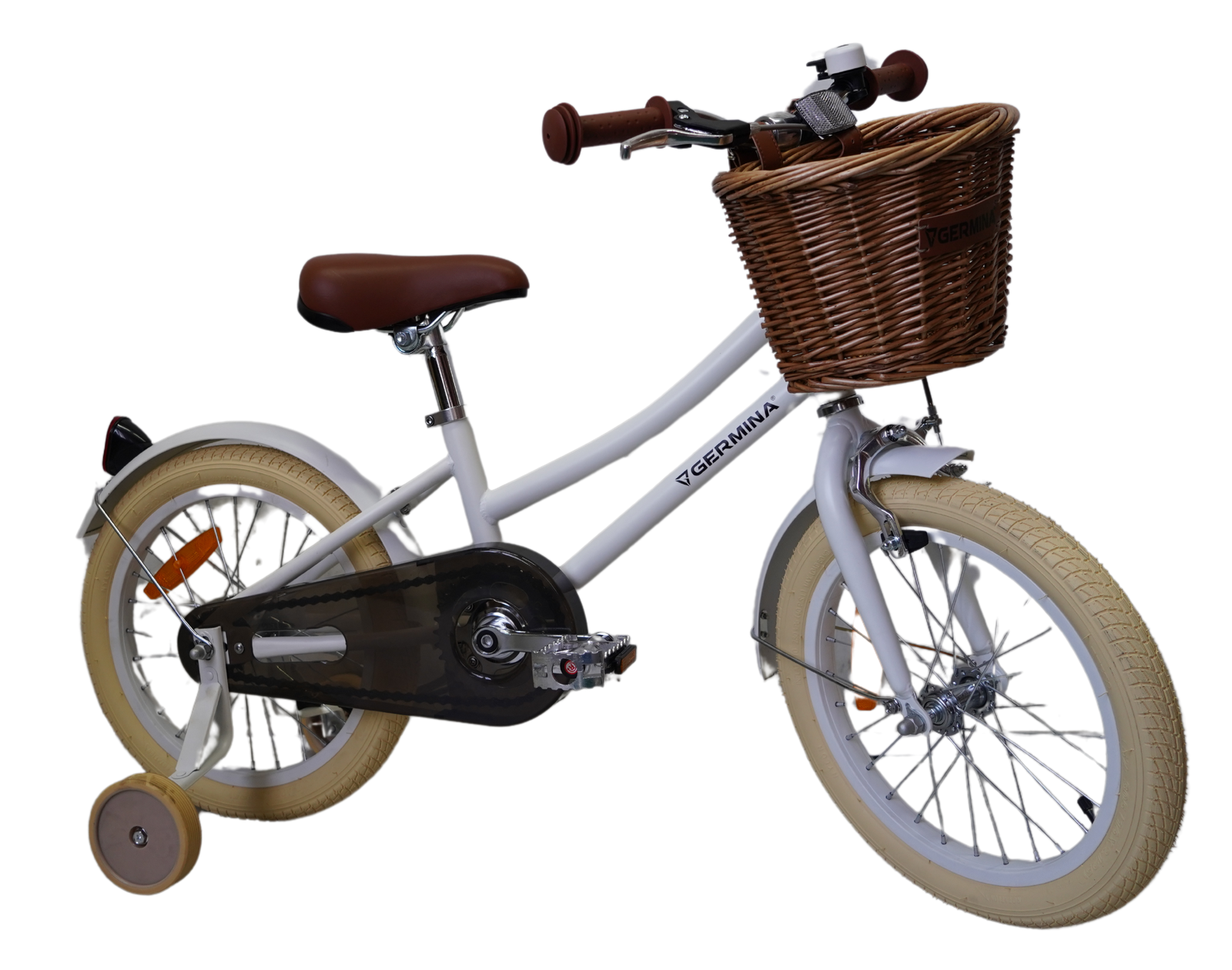 Rowerek dziecięcy w stylu VINTAGE 16”Rowerek dziecięcy w stylu VINTAGE marki Germina to nie tylko pojazd, ale także symbol przygody, radości i niezapomnianych chwil spędzonych na dwóch kółkach. Dzięki starannej konstrukcji, solidności i wyjątkowemu designowi, ten rowerek nie tylko rozwija umiejętności dziecka, ale także zapewnia mu bezpieczną i komfortową podróż w każdym zakątku świata, który ma ochotę odkryć. Z rowerkiem marki Germina każda droga staje się niezwykłą przygodą, a każda chwila spędzona na nim staje się niezapomnianym wspomnieniem.Bezpieczna jazda w każdych warunkach!Dzięki błotnikom jazda nawet w niepogodzie będzie przyjemna. Rowerek został wyposażony w niezawodny hamulec torpedo. Proste i skuteczne hamowanie to podstawa bezpieczeństwa każdego małego rowerzysty. Połączenie przedniego hamulca U-Brake oraz tylnego Torpedo będą w pełni niezawodne podczas podróży Twojego dziecka. Jego dużą zaletą jest prosta konstrukcja, lekkość i łatwa konserwacja.Ten stylowy rowerek został wyposażony w szerokie i stabilne kółka podporowe, błotniki i wiklinowy koszyk.Pewny chwytUchwyty kierownicy w rowerze GERMINA są dobrze wyprofilowane, co zapewnia lepszą kontrolę nad rowerem.Specyfikacja:Materiał ramy: StalRozmiar koła: 16”Hamulec tył: TorpedoHamulec przód: U-BrakeOsłona łańcucha: PełnaWyposażenie: Błotniki, dzwonek, koszyk wiklinowy, odblaski, kółka boczneRower przeznaczony dla dzieci w wieku: 4-6 lat Każdy rower jest fabrycznie zapakowany, czyli ma zdemontowaną kierownicę, siodło, pedały. Elementy te należy złożyć samodzielnie. W niektórych egzemplarzach może być koniecznie wykonanie niektórych podstawowych regulacji, które opisuje instrukcja obsługi.