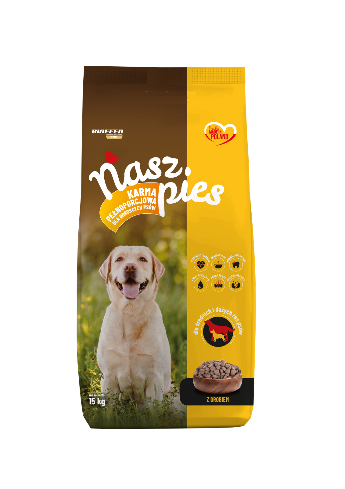 Nasz Pies to pełnoporcjowa sucha karma dla psa z kurczakiem. Przeznaczona dla dorosłych psów wszystkich ras. Zawiera wszystkie składniki pokarmowe niezbędne do prawidłowego funkcjonowania organizmu psa.