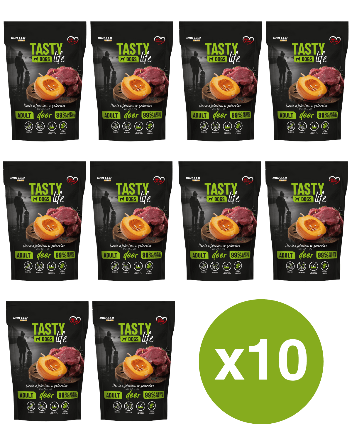 ZESTAW: Mokra karma dla psów Tasty Dogs Life JELEŃ 90% - danie w galaretce (saszetka) 10x 500 g