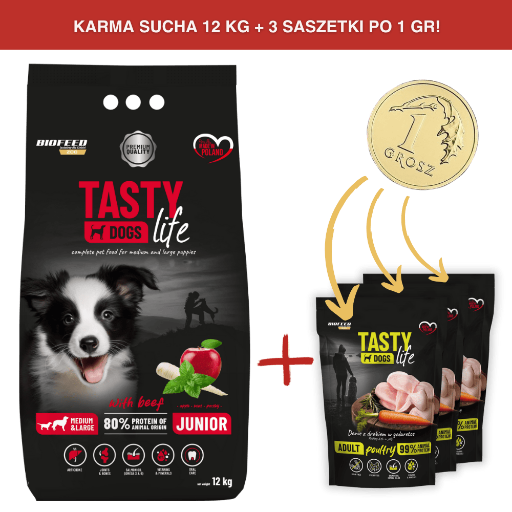 Karma dla szczeniąt Tasty Dogs Life z wołowiną 12 kg (średnie i duże rasy)Cena: 134,99 zł / szt.Produkt niedostępny.