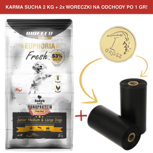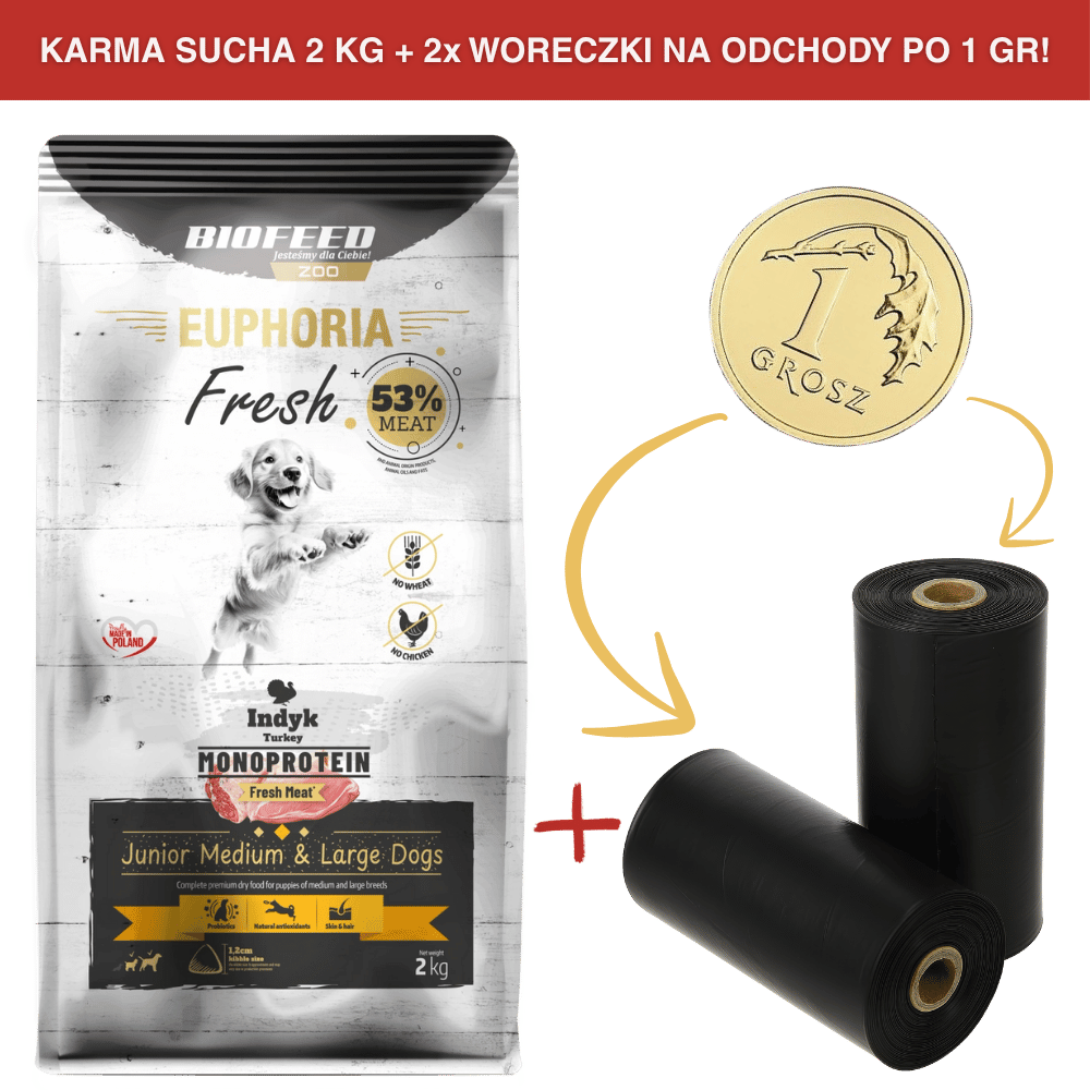 ZESTAW: Karma dla szczeniąt EUPHORIA Fresh Turkey Monoprotein (średnie i duże rasy) 2 kg + 2 rolki woreczków na odchody PO 1 GR