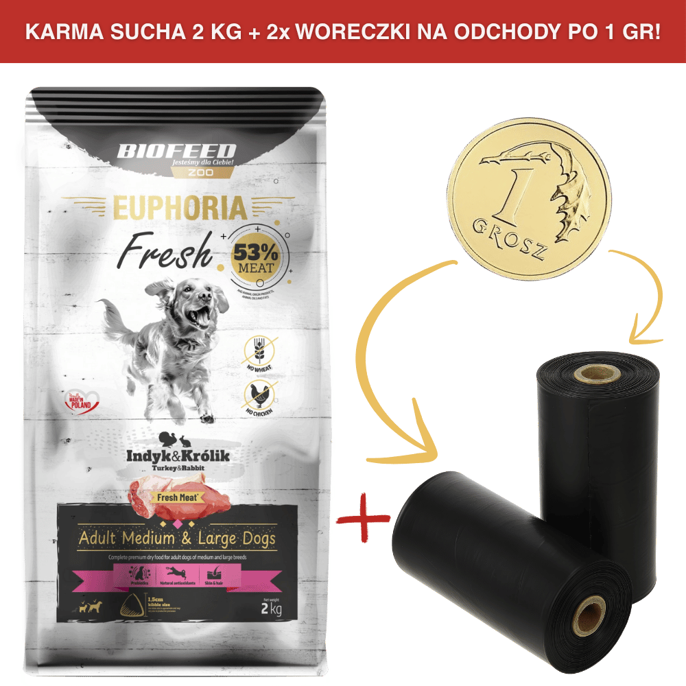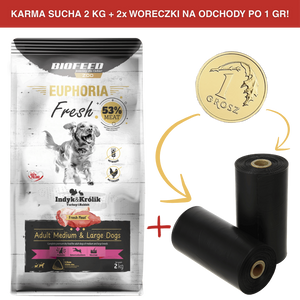 ZESTAW: Karma dla psów EUPHORIA Fresh z indykiem i królikiem (średnie i duże rasy) 2 kg + 2 rolki woreczków na odchody PO 1 GR