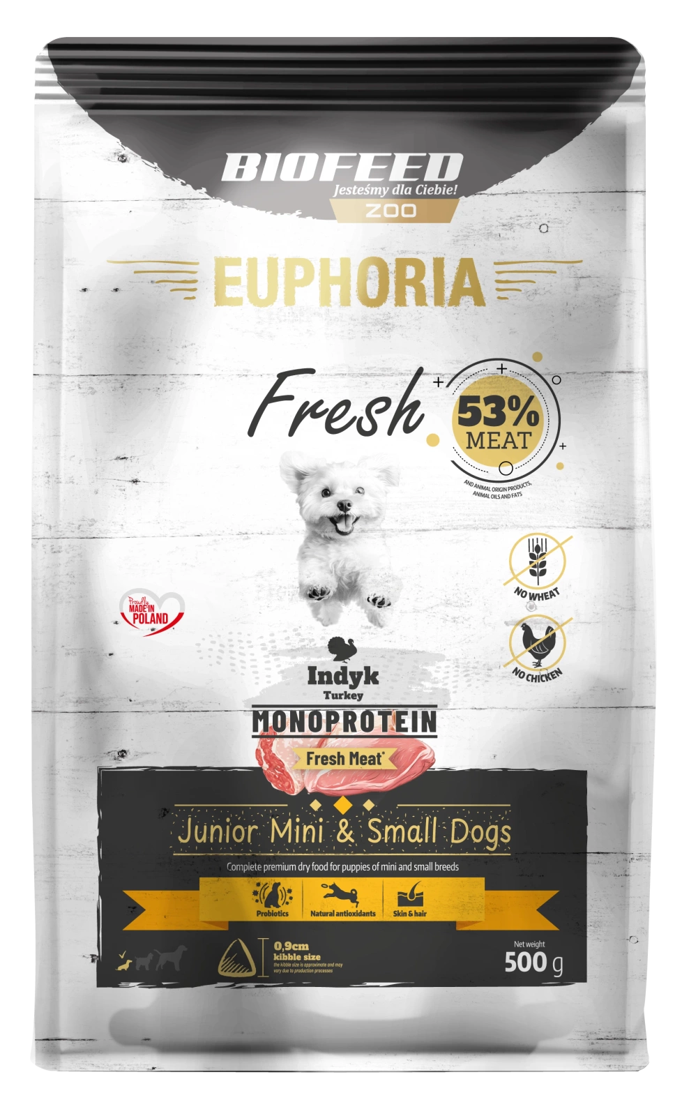 Karma dla szczeniąt EUPHORIA Fresh Turkey Monoprotein (mini i małe rasy) 0,5 kgCena: 19,99 zł / szt.