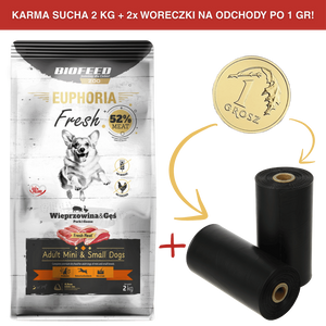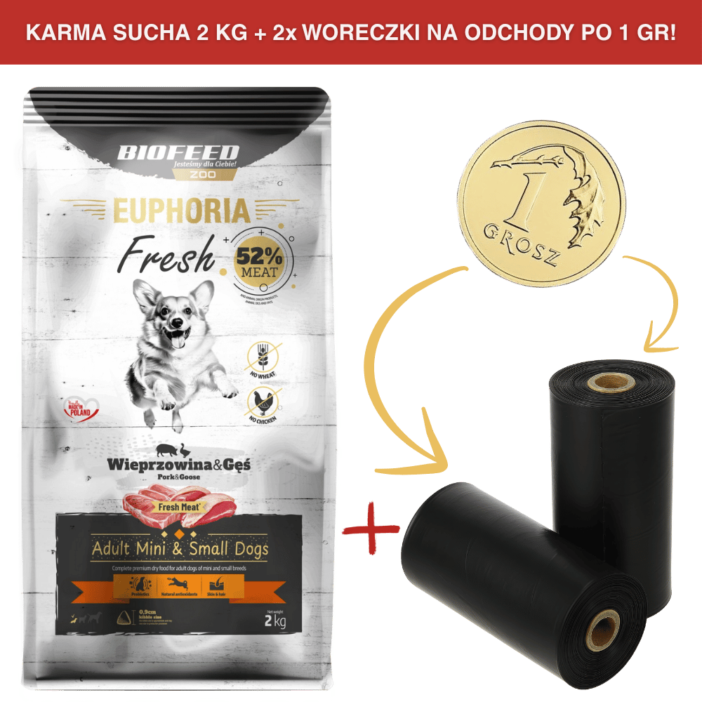 ZESTAW: Karma dla psów EUPHORIA Fresh z wieprzowiną i gęsią (mini i małe rasy) 2 kg + 2 rolki woreczków na odchody PO 1 GR