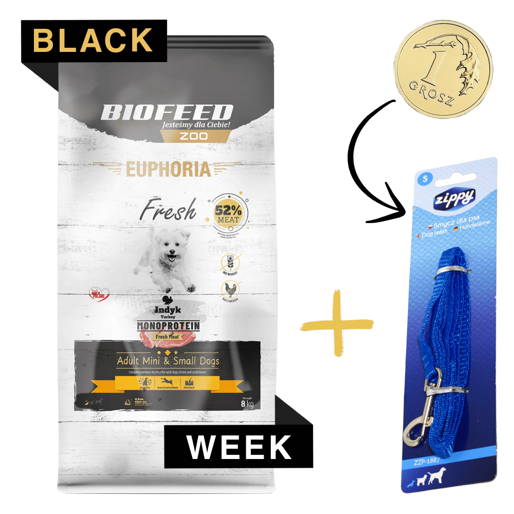 ZESTAW: Karma dla psów EUPHORIA Fresh Turkey Monoprotein (mini i małe rasy) 8 kg + Niebieska smycz dla psa S (1 m)