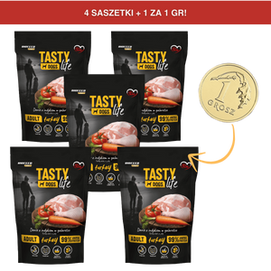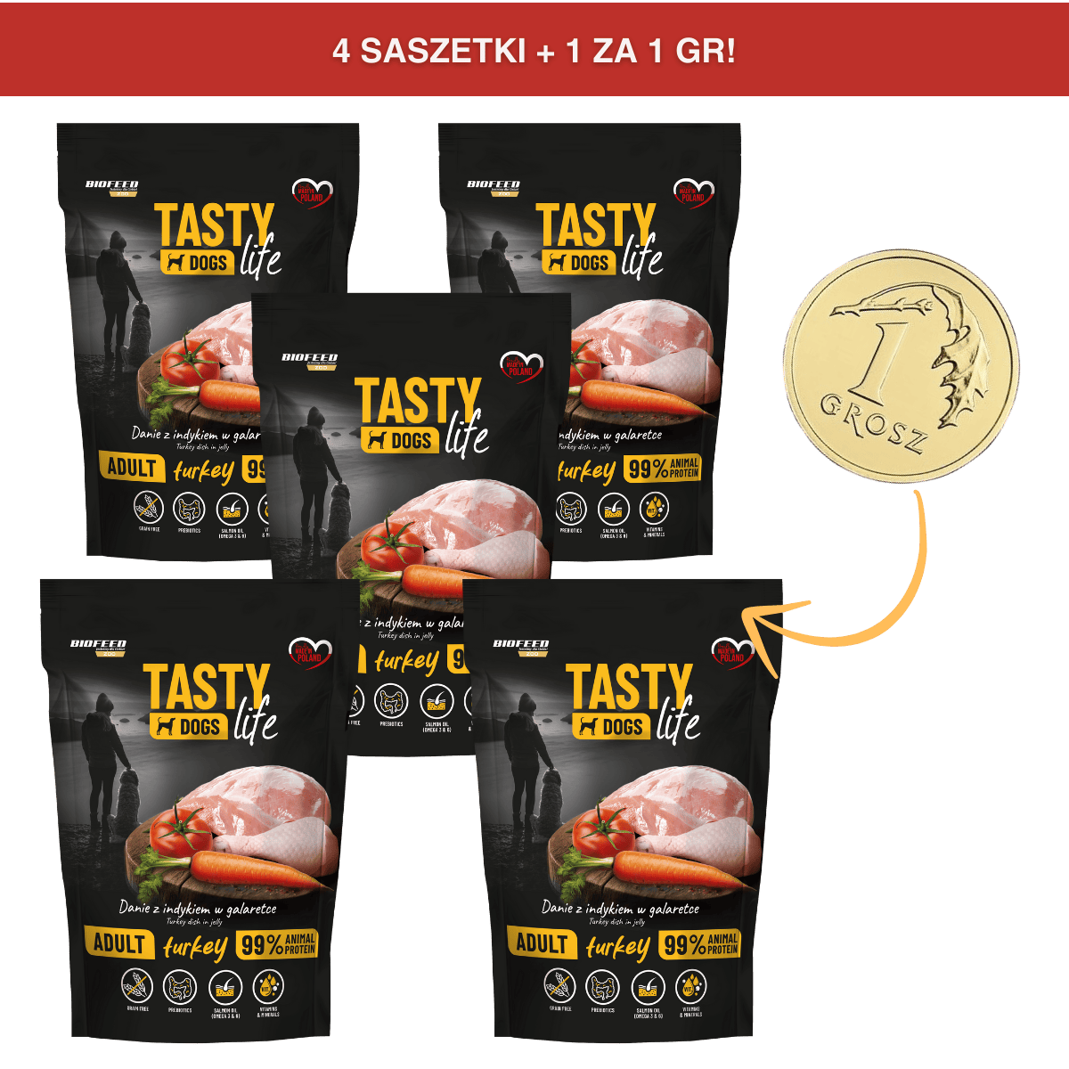 [4+1 ZA GROSZ] Mokra karma dla psów Tasty Dogs Life INDYK 90% - danie w galaretce (saszetka) 500 g