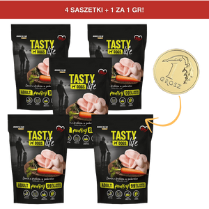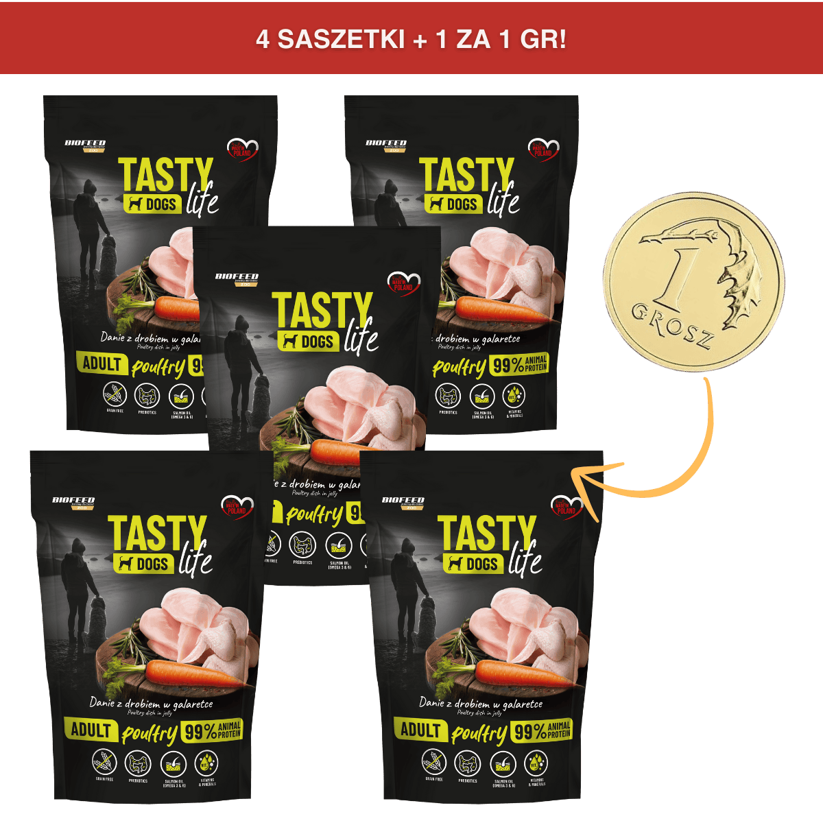 [4+1 ZA GROSZ] Mokra karma dla psów Tasty Dogs Life DRÓB 90% - danie w galaretce (saszetka) 500 g