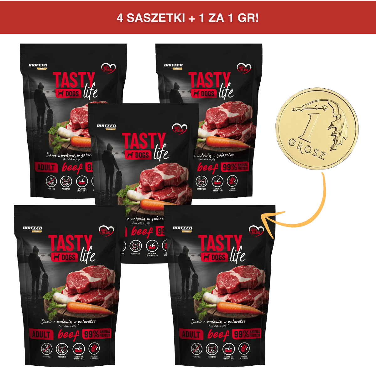 [4+1 ZA GROSZ] Mokra karma dla psów Tasty Dogs Life WOŁOWINA 90% - danie w galaretce (saszetka) 500 g